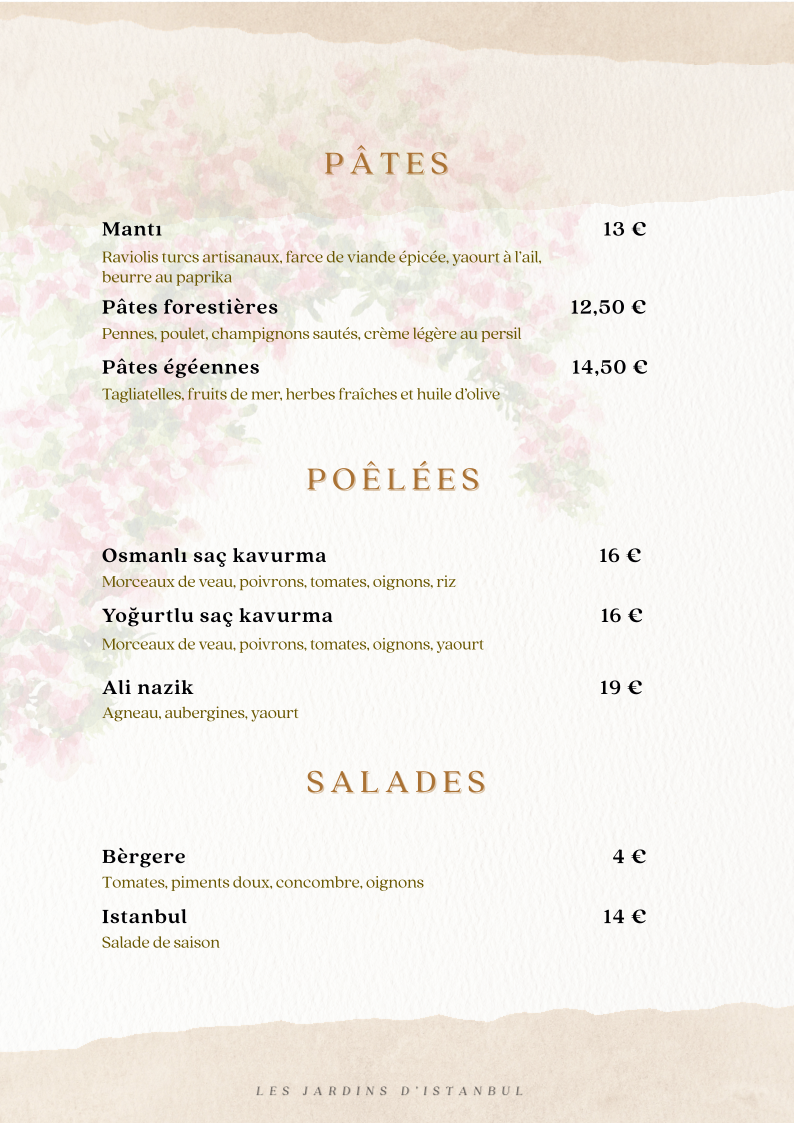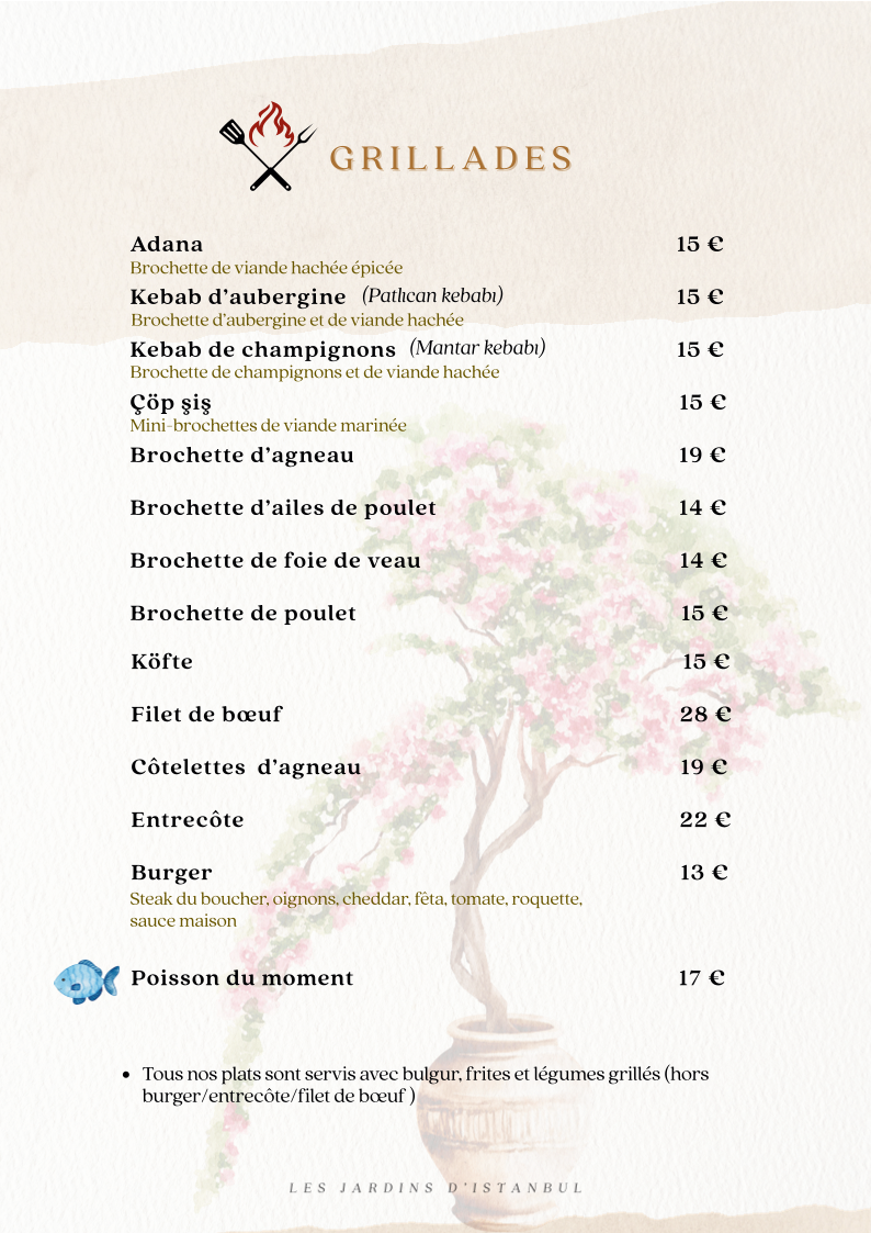 Welcome to Les Jardins d'Istanbul, an exquisite gem situated at 52B Pl. de la Croix de Pierre in Issoudun, France. This restaurant offers a delightful journey through authentic Turkish cuisine, captivating guests with both flavor and ambiance. Reviews speak of generous portions and meticulous presentation, showcasing dishes that cater to all palates.